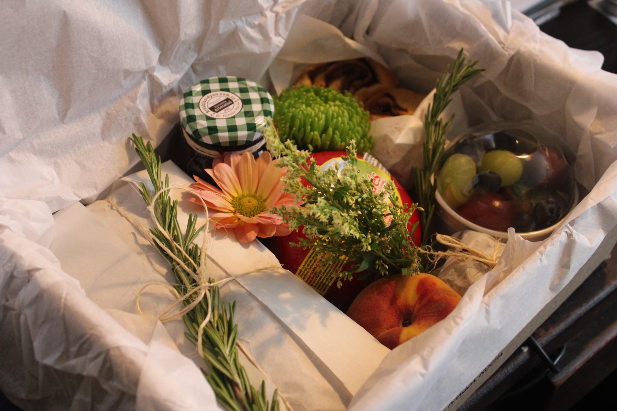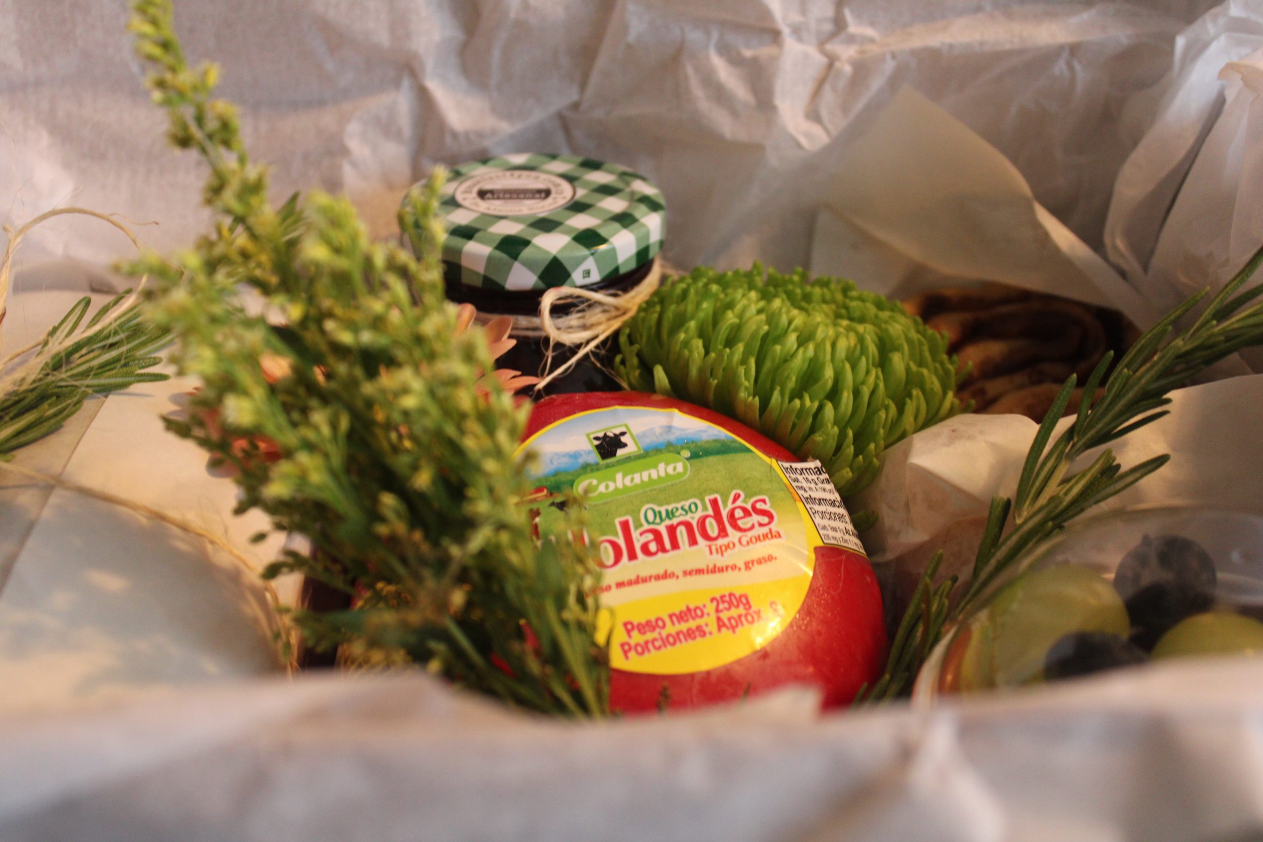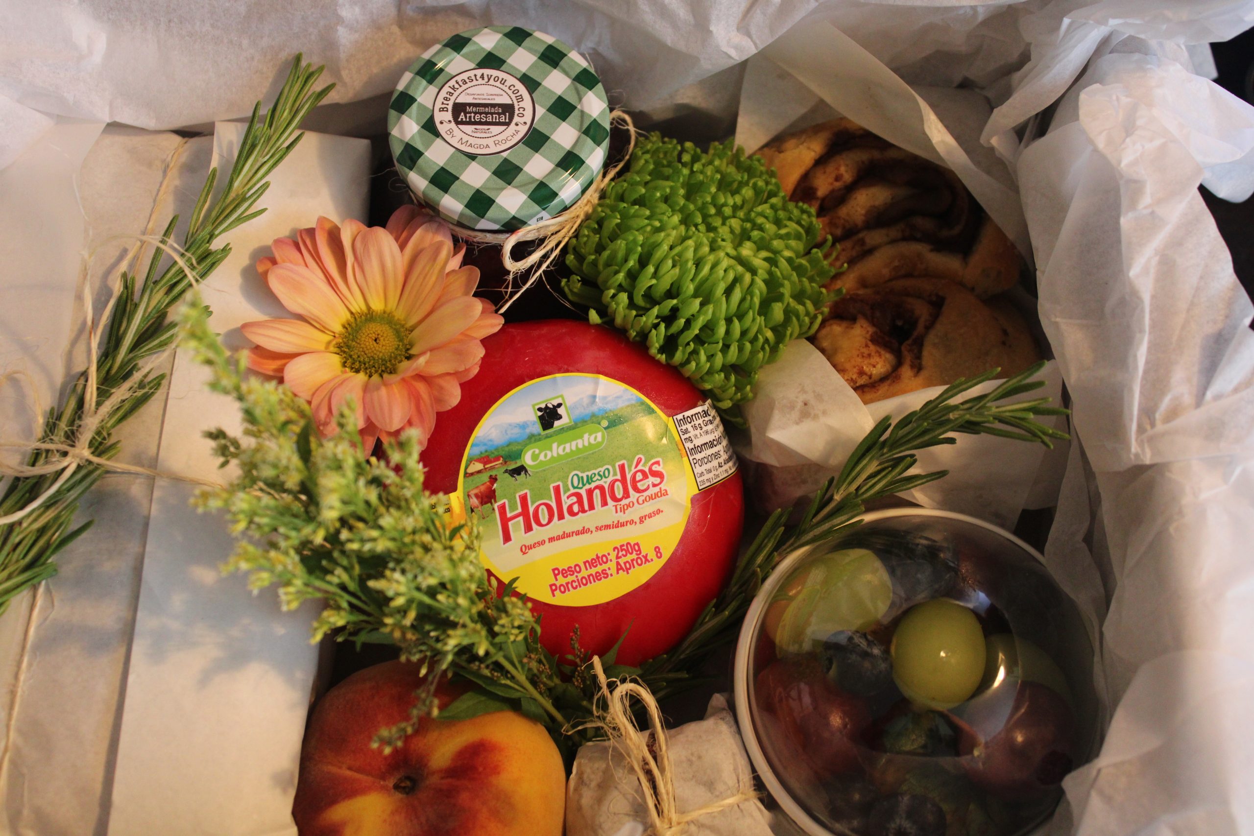 Para equilibrar, incluimos un durazno de importación y un bowl fresco con frutos rojos, amarillos y uvas seleccionadas.